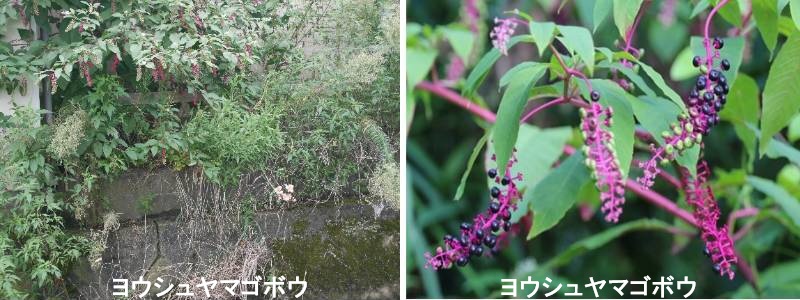 ヨウシュヤマゴボウは、北アメリカ原産で、草丈が2メートルにも達するとても大きな多年草です。日本には明治時代に渡来し、現在は空き地などではびこっています。なおヨーロッパでは、庭のアクセントとして、園芸用に栽培されています。茎はさかんに枝分かれをしながら、旺盛に生育し、夏から秋にかけ、次々と花の穂を出します。花の直径は5ミリメートルから6ミリメートルほどで、花びらはありませんが、5枚の丸っこいがくが開いて、まるで小さな梅の花のように見えます。秋、まるでぶどうのような果実の穂ができます。見た目は美味しそうですが、有毒で食べられません。ただ、鳥は好むようで、タネは鳥によってあちこちに運ばれていきます。果実をつぶすと、赤紫色の汁が採れ、染料としても使われます。