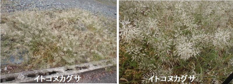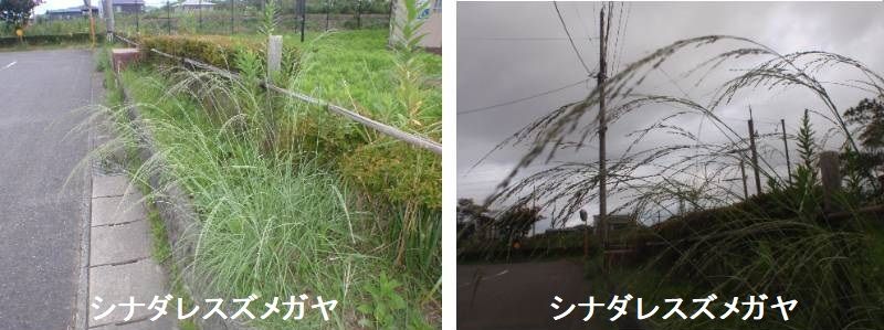 シナダレスズメガヤは南アフリカ原産の多年生草本で、法面の緑化などの目的で導入されました。葉は細くて(~2mm)垂れ下がっています。乾燥すると葉は上面を巻き込んで更に細くなります。初夏から盛夏にかけて花穂を形成します。花の色は灰緑色のものから紫色のものまであり、多様です。乾燥に強く、荒れ地の緑化などに用いられています。法面の緑化では、複数の種類を混合して播種することが普通ですが、オニウシノケグサと混合して播種されると、乾燥する痩悪地ではシナダレスズメガヤが、適潤地ではオニウシノケグサが優勢となります。シナダレスズメガヤは株状となって繁茂し、葉が垂れ下がるために株と株の間が無植生となる傾向が高いです。