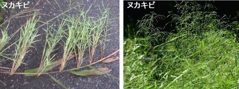 ヌカキビは、野原や林縁、水辺など、やや湿った草むらに、ごく普通に生えている1年草です。茎が細くて弱々しい印象を受けますが、草丈が1メートルを超えることも珍しくなく、背の高い草の合間からひょっこり顔を出して、自分の場所をしっかり確保しています。茎の下部は地面につくと、節から発根することがあります。葉は長さ5センチメートルから30センチメートル、幅0.5センチメートルから1センチメートルほどの先がとがった細長い形で、他のイネ科植物と形態がよく似ているため、穂のない時期に識別するのは難しいかもしれません。茎や葉は無毛です。夏から秋にかけ、茎の先から長さ10センチメートルから30センチメートルほどの穂を出します。多数の細い枝が横に広がり、円錐形の広がりとなります。小穂は長さ2ミリメートルほどととても細かく、これを「糠」に見立てたのが名前の由来です。