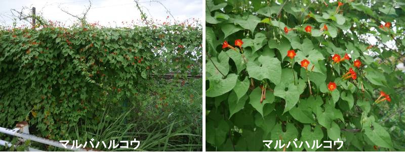 マルバルコウは、熱帯アメリカ原産で、日本には江戸時代に観賞用に渡来しました。現在はほとんど栽培されることはなく、繁殖力の強いつる草として道ばたや畑地などにはびこっています。特にトウモロコシ畑で問題となっており、作物に絡みついて成長が悪くなったり、収穫時に絡まって機械作業の妨げになったりしています。茎はつる性で成長が早く、あちこちに絡みつきながら数メートルもの長さにのびていきます。葉は縦長のハート形で先はとがり、縁はところどころが角張ったような感じになります。夏から秋に直径2センチメートルほどの鮮やかな朱色の花を咲かせます。花の中心はやや黄色っぽくなっています。果実が未熟な状態で茎が切れてしまっても、切れた状態のまま熟すことができ、きちんと発芽能力のあるタネができるといいます。