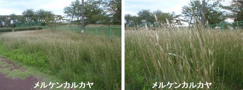 メルケンカルカヤは、北米原産の多年生イネ科雑草で、日本では1940年ごろに愛知県で確認されました。現在では、東北以南に広く分布しています。畑地、樹園地、牧草地、路傍、荒地などの日当たりが良く、土壌が乾いた所に多く見られます。種子によって繁殖し、根付くと抜き取りにくい丈夫な株を形成しています。他の植物の生育が困難な酸性土壌や岩山などでも生育可能であり、このような場所を住みかとする在来の希少植物を圧迫する可能性も指摘されています。ゴルフ場のラフや公園、家周りの芝地内などにも侵入し、有効な芝用除草剤が少ないため、防除しにくいやっかいな雑草となっています。
