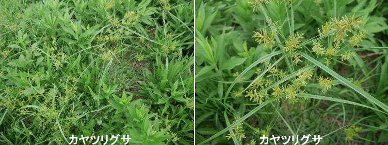 カヤツリグサは、身近な場所によく生える1年草です。庭先や植木鉢の中に自然と芽生えてくることもあります。コゴメガヤツリやチャガヤツリなど、他のカヤツリグサ類とともに一緒に生えていることもしばしばです。茎の先端から数本の「花序枝」が伸び、その先に黄土色の穂をつけます。遠目に見ると、まるで線香花火のように見えます。また、葉と同じような形の苞葉が、穂の下に数枚つきます。穂の鱗片は先がややとがった形をしていて、中肋と呼ばれる緑色の部分が少し突き出るのが特徴です。過酷な環境下に生えたものや、秋以降に芽生えたものは、10cm 以下の草丈で穂を出すこともあります。花序枝が出ないことも多く、茎の先にちょぼっと穂がつく感じになります。