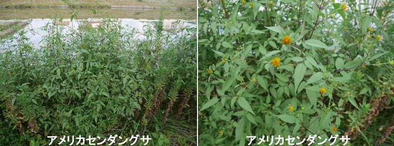 アメリカセンダングサは、日本には大正時代にやってきたと考えられ、今は日本全国でふつうに見られる存在になっています。水田や湿地などの水辺を好みますが、環境適応能力が強いため、畑地や乾燥した荒れ地などにも生えることがあります。同じ仲間で水田に生えるものとして日本在来のタウコギがあります。それに似て背が高くなることから、セイタカタウコギの別名もあります。花期は秋です。茎の先に、多数の小さな黄色い花(筒状花)が、まるく集まってつきます。稀に、黄色い舌状花がつくこともあります。この花の集まりの外側には、細長い総苞片が何枚もつき、まるで緑色の花びらのように見えます。