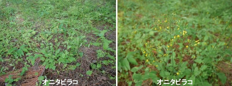 今までオニタビラコとされてきた植物は、新しい研究によってアオオニタビラコとアカオニタビラコの2つの亜種に分けられました。アオオニタビラコ、アカオニタビラコともに、市内ではいたるところにごく普通に見ることができます。アオオニタビラコは道ばたや公園など街っぽいところに多い傾向がある多年草です。葉は深緑色でやや光沢があります。細い茎を何本も立ちあげ、その先に小さな黄色い花を咲かせます。季節に関係なくだらだらと咲き続ける傾向があります。アカオニタビラコは野原や畑地などに多い越年草で、茎や葉は毛が多く、全体的に赤みがかった色をしています。春になると太い茎が1本立ち、その先に多数の花がかたまって咲きます。ときに細い茎が2本から3本出ることがありますが、メインとなる太い茎が必ず1本あります。