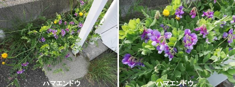 北海道から沖縄にかけての海岸、まれに湖や川原などの砂地の草原に生育します。葉や茎はやや白みがかった緑色をしています。葉は8~12枚の小さな葉(小葉)からなり、葉の軸の先端は巻きひげになっています。小葉の長さは1.5~4cm、幅は1~2cmです。 花は4~7月頃に咲き、紫色~白みを帯びた紫色で、長さ2.5~3cm、茎の先の方に3~6個つきます。地面を這うように生育します。紫色の花をつけるマメ科の植物は他にもありますので、小葉の数や花の大きさ、形などに注目してさがしてみてください。海岸や湖岸、川原の砂地に生えているかどうかも識別するときの重要なポイントです。 海岸砂地の草原に生える似た種類としては、北海道、本州(近畿地方以東)に分布するヒロハクサフジなどがあります。