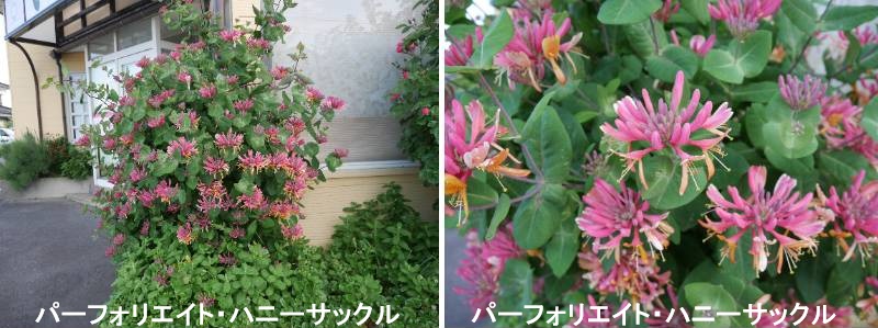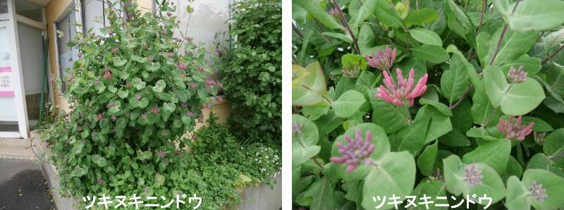 ツキヌキニンドウは、スイカズラ科スイカズラ属の常緑、あるいは半常緑のつる植物です。花の下の1~2対の葉が合着し、茎が葉の間を突き抜けているように見えるのが名前の由来です。忍冬はスイカズラの和名で、冬でもグリーンの葉が残るので、冬を耐え忍ぶという意味で忍冬と言います。ツキヌキニンドウは、茎の先に細い筒状の花が3個セットで咲きます。さらに反対側にもう3個1セットで花を咲かせるので、合計6個の花が咲いているように見えます。花の色は赤に近いオレンジ色、筒状の花の先は5つに裂けるように開いていて、その内側は黄味を帯びたオレンジ色なので、とても鮮やかな印象を受けます。花には香りはありません。近縁種に、日本原産のスイカズラ、ヨーロッパ原産で香りの良い花を咲かせるニオイニンドウ、エトルスカ・ハニーサックルや、これらの園芸種などがあります。