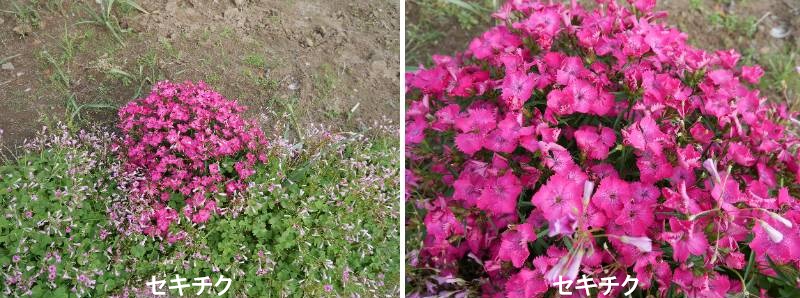 中国原産の二年性植物で、日本には古くに伝来し、平安時代から観賞用として栽培されています。「石竹(セキチク)」という名は、岩場に自生し、茎葉の見た目が竹に似ていることに由来します。草丈は30cm程で、茎には節があり、そこから葉を輪生させます。茎の先端に花をつけ、花弁は先が細かく裂け、色は紅色、淡紅色、白色などがあります。当園では8月の下旬から現在まで長く花を咲かせ続けています。セキチクは、日本で品種改良が盛んに行われており、多くの品種が生まれています。その中には、「三寸セキチク」、「五寸セキチク」などの系統があり、それぞれに園芸品種があります。そのほか有名な品種では、セキチクから改良された「常夏」、カワラナデシコとの雑種から改良された「伊勢撫子」などがあります。