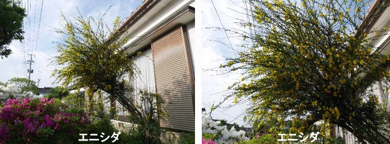 エニシダ属は常緑または落葉性の低木で、ヨーロッパ、北アフリカ、カナリア諸島、アジアに分布します。乾燥地で無駄に水分が奪われないよう葉は小さく、その分、緑色の枝でも光合成が行われます。和名のエニシダと呼ばれる種は、常緑性のCytisus scopariusを指します。5月から6月に鮮やかな黄色の花が、輝くように株を包みます。耐寒性もあり、やせ地でも育ちますが、寿命は10年ほどです。黄色の花に赤色の入ったホホベニエニシダは本種の園芸品種です。別種に真っ白な花をつけるシロバナエニシダがありますが、こちらは落葉低木です。また、「金雀枝」や「金雀花」と書いてエニシダと読み、俳句で夏の季語として登場します。 英名は、「Broom(箒)」といい、体を浄化するものとしての有用性を示しているそうです。