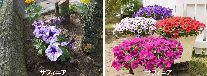 'サフィニア' 」。「サフィニア」の名称はサントリーフラワーズの登録商標です。ペチュニアでは初めての本格的な栄養繁殖系で、ペチュニアの原種が持つ長日植物である弱点を完全に払拭した園芸品種です。不稔性が高く、生育しても草姿が乱れず、花数が多く花期が長いという特長があります。開花時期は4月から10月で、耐寒性の低い常緑多年草、一年草であり、10月から11月に地上株は寒さで枯れますが、温度管理を適切に行えば越冬も可能です。また越冬株は1年目よりさらに大きく育ちます。