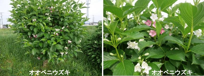 オオベニウツギは、中国原産で、高さが2~3メートルになる落葉低木です。葉腋に、長さ2.5~3.5センチの濃紅色の花を数個ずつつけます。花冠は漏斗状鐘形で、上部は浅く5裂しています。萼は長さ約5ミリの線形で、5裂しています。葉は卵状長楕円形で、先は細長くとがり、縁に浅い鋸歯があります。表はまばらに毛があり、裏には白色の短い軟毛が密生し、ややざらつきます。タニウツギの仲間で、庭木として広く利用されているといいます。花が枝にびっしりと咲き、全体的な景観がとってもキレイな品種です。 薄いピンクの可愛らしい花と、やや黄味がかった白の覆輪の斑入り葉を持つ人気の低木です。 近年は、暖冬の影響で開花時期が早まっており、3月下旬には開花している地域もあるようですが、梅雨前に咲く花です。