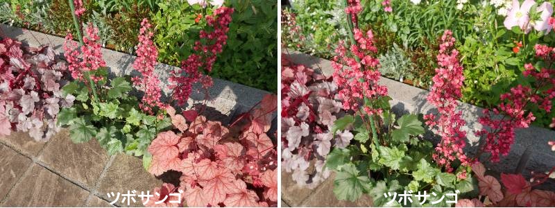 ツボサンゴは、ペレニアルガーデンには必ずといってよいほど植栽される宿根草です。日本では以前から花を楽しむために植えられていましたが、欧米から葉の美しい品種が導入され、葉を楽しむグランドカバーとして用いられることが多くなりました。初夏に長い花茎を伸ばして、つぼ型の花を咲かせます。花色は赤が普通ですが、葉色を楽しむものの中には白や緑など地味なものもあります。葉は浅く切れ込みが入ります。葉脈に沿って赤や白の斑が入りますが、葉色によっては斑の色が目立たないものもあります。株はロゼットタイプで花のない時期はコンパクトな姿です。通常は地植えに向いており、下草や根じめ、ボーダーガーデンの前景、グランドカバーに用います。花を期待する場合はよく日の当たる場所に置きます。葉を楽しみたい場合は木漏れ日が当たる程度の半日陰の場所で育てます。半日陰でも比較的明るい場所に置かないと茎が徒長しがちになるので注意してください。