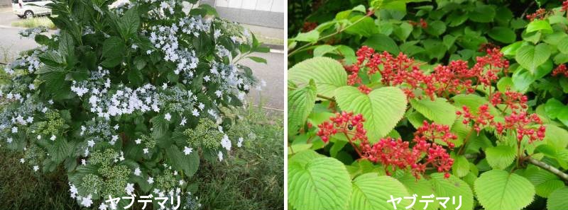 ヤブデマリは、・花や実の美しさから、近年は庭木として使われるようになりました。ピンクの花を咲かせる「ピンクビューティー」や「恋花火」などの園芸品種も出回っています。また白くて大きな毬状の花を咲かせるオオデマリもヤブデマリの変種とされることがあります。ヤブデマリの開花は5月~6月で、オオカメノキ(ムシカリ)やカンボクに似る。枝にびっしりと咲き誇り、花の季節になると昆虫がよく集まる。花序は直径5~10センチほどです。花弁のように見えるのは装飾花で、五つに裂けますが、うち1つだけが小さいです。本当の花は中央にある黄色い部分で両性花です。雌しべ1本と5本の雄しべがあります。ヤブデマリの葉は円形で直径は5~10センチほど。先端は尖るのが普通だが、中には浅く凹むものもある。葉の縁には浅いギザギザがあり、7~12対ある葉脈が目立ちます。