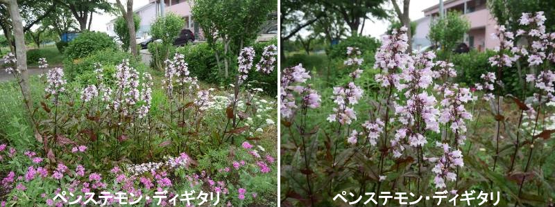 ペンステモンは釣り鐘形や、筒状でふっくらした形の愛嬌のある花が連なるように咲き、まるでカラフルな熱帯魚が群れをなして泳いでいるようにも見えます。北アメリカ西部からメキシコを中心に約250種の原種があり、木立ち性のものから這い性のものまで形状はさまざまです。長い穂になって咲くものや房状に固まって咲くものなど、バラエティに富み、花色も豊富で、複色のものも多く見られます。ほとんどのものは常緑性で、冬のグリーン材料としても重宝します。ロゼット状で冬越しするタイプと茎立ちの状態で冬越しするタイプとがあります。冬の低温を経て、その後の長日条件で開花しますが、園芸品種のなかには、開花のための低温が不要で、しかも長期間咲き続けるものもあります。夏の高温多湿や長雨による蒸れに弱いものが多いため、宿根草として利用できる種類は限られ、タネまきが容易な園芸品種では、秋まき一年草扱いとされています。