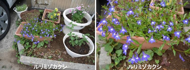 ルリミゾカクシ(瑠璃溝隠)は、キキョウ科ミゾカクシ属の多年草です。別名ルリチョウソウ(瑠璃蝶草)、ルリチョウチョウ(瑠璃蝶々)、属名からロベリア(魯別利亜)とも呼ばれています。原産地は南部アフリカのマラウィ、ナミビアから南アフリカにかけてです。亜熱帯では多年草ですが、温帯では秋蒔き一年草として扱うことが多いです。開花期は春。暑さにも寒さにもあまり強くありません。草丈は8〜15cmで、茎の下部につく葉は長さ10mm幅4〜8mmの楕円形で鋸歯があります。上部につく葉は細く、鋸歯がないこともあります。野生種は幅8〜20 mmの花をつけ、花弁は5つで、色は青や紫です。花序は間隔の開いた円錐花序で、果実は5〜8mmの蒴果で、内部に無数の細かい種子を生じます。花として販売、栽培されており、白、ピンク、赤などの花色も作出されています。また暑さへの耐性を強めた改良品種も作られています。