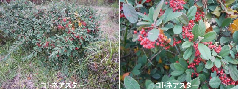 コトネアスターは、寒さに強く、また果実や紅葉が美しく、小型の種類があるために、庭園樹としてよく栽培されています。ピラカンサによく似ていますが、コトネアスターの葉には鋸歯(きょし)がないこと、枝にはとげがないことで区別されます。コトネアスターの仲間は、旧世界(アフロ・ユーラシア大陸)の北半球に約400種が分布する、落葉、または常緑の木本植物です。中国原産のベニシタンは、赤色の果実と枝が横に広がる樹形で、最も広く栽培されていますが、近年は、果実がより美しい園芸品種も導入されています。栽培は容易で、極端に乾燥しない日なたであれば、毎年美しい果実を楽しむことができます。
