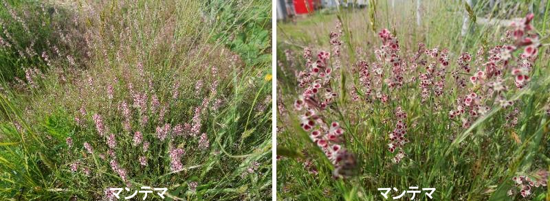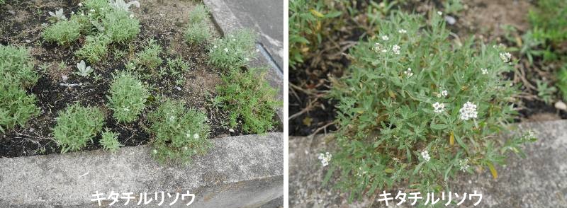 マンテマは、ナデシコ科マンテマ属に属する草本の一種です。ヨーロッパ原産の一年草で、日本では江戸時代に観賞用に持ちこまれ後に逸出し野生化し、本州中部以南の河川敷、市街地、海岸などに見られる外来種となっています。マンテマは、およそ150年ほど前、観賞用にと日本にはいってきたとされるかなり古い帰化植物です。いまどきのガーデニングでカラフルな園芸植物とちがって、ずいぶんと控えめです。しかし、花びらの紅色の紋のまわりが白くふちどられ、小さい花ながら人の目をひきます。シロバナマンテマのロゼット葉は,歩道の低い木の植え込みのふちで、冬の日を浴びて春にそなえています。地ぎわから広げている根生葉(ロゼット葉)はしゃもじ形をしています。道路ぞいの街園の草地に群がって生えているところです。花は白色からうすいピンク色で、だいたい同じ向きに突き出しています。マンテマとのちがいは、ヒトにたとえますと人種のちがいのようなもの。どちらも花の大きさは1cmぐらいですがシロバナのほうは花びらも細くてマンテマより見劣りがします。