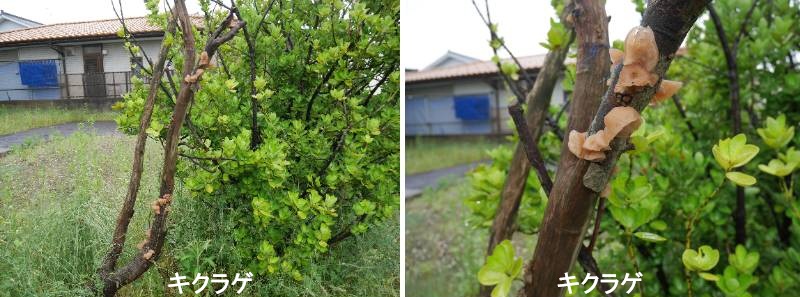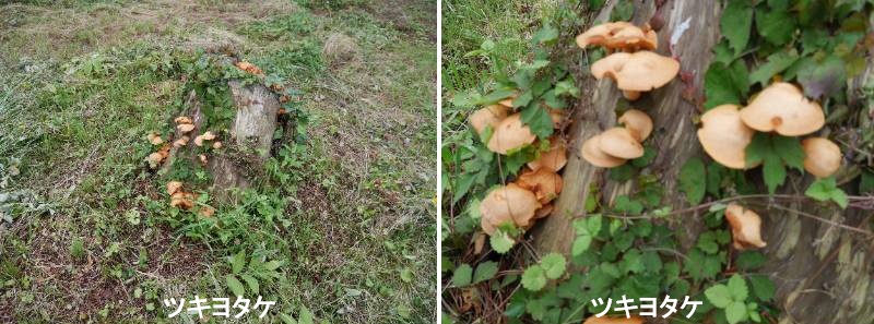 ツキヨタケは、初夏~秋に、ブナなどの広葉樹の倒木や枯れ木などに多数重なり合って発生します。中型~大型で、傘は半円形~じん臓形(長径 10~25cm)、表面ははじめ黄橙褐色でやや濃色の小鱗片がありますが、成熟すると紫褐色~暗褐色となり、多少ろう状の光沢を帯びます。ひだは垂生(柄に対し、ひだが下向きの弧を描いて付着)し、淡黄色のち白色で幅広く、暗所で青白く発光します。柄は長さ2cm程度で太短く、傘のほとんど側方、まれに中央に付き、隆起した不完全なつばがあります。縦に裂くと、柄の付け根部分にふつう黒紫色、まれに淡褐色のしみがあります。肉は白色でやわらかく、柄に近い部分は厚く、食用のヒラタケ、ムキタケ、シイタケに、外見、色彩、サイズ等が酷似しているため、誤食による中毒がクサウラベニタケに並んで多く発生します。