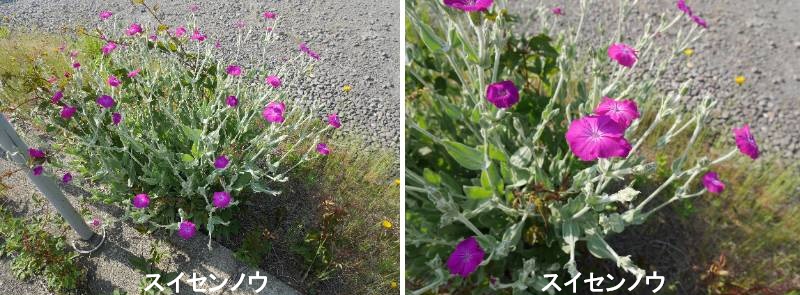 スイセンノウはヨーロッパ南東部の原産で、二年草あるいは短命な多年草です。スイセンノウは、ビロードのような白い毛の生えた株と、小さいけれど目立つ整った花が魅力的です。花は花茎を分枝させその頂部に咲かせます。一重で花つきもよいです。葉色や茎が銀色で細かい毛が生えています。株はロゼット状ですが開花時は長い花茎を伸ばします。タネから育てる場合、開花には低温に合わせる必要があるので秋まきにします。高温多湿には弱いものの、こぼれダネでも増える丈夫な花です。5月から7月の中頃にかけ、派手な赤色のナデシコの仲間が花壇などで目立っています。栽培植物なので気にしていなかったのだが、注意して見ると荒地に勝手に生育しているものが結構あります。園芸植物の逸出です。スイセンノウは白い毛が全草に多いことからフランネルソウとも呼ばれています。