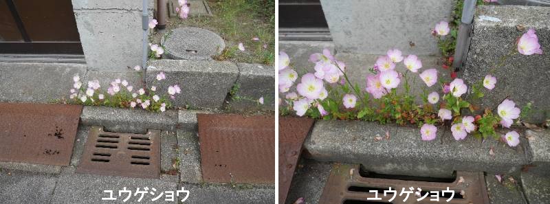 ユウゲショウは、アカバナ科の多年草の帰化植物。日本には観賞用植物として入ってきたものが野生化し、関東以西に広く分布しています。夕方に咲くことが名前の由来とされていますが、実際には昼間から咲く一日花です。夏から秋にかけて、明るいピンク色の花が次々と開花し、めしべの先が十字状になる特徴があり、白花もあります。多年草ですが種でも繁殖し、日当たりの良い道端、河原、野原、空き地などいたるところで見かけます。ユウゲショウはアカバナユウゲショウとも呼ばれ、アメリカ大陸(熱帯地域)原産の外来(帰化)植物で、日本国内では、主に関東以西の市街地や荒れ地、耕作地周辺など日当たりが良く、乾燥気味の場所で見られる多年草です。世界の暖温帯地域に広く帰化しており、日本には明治時代に観賞用の園芸植物として持ち込まれたものが逸出(逃げ出し)、野生化したとされます。