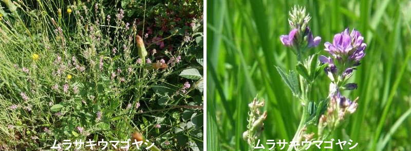 ムラサキウマゴヤシは、地中海沿岸原産で、日本には明治初期に入り、北海道などで栽培されているほか、各地に帰化しています。日本で見られるウマゴヤシ属のなかで、紫色の花が咲くのはムラサキウマゴヤシだけなので、見分けやすいですが、茎が直立し、小葉が細長いのも特徴です。高さは30〜90cm。小葉は長さ2〜3cm、幅0.5〜1cmで、豆果はらせん状に巻きますが、ウマゴヤシのような刺はありません。花期は5〜9月です。ムラサキウマゴヤシ(紫馬肥やし)は、マメ科ウマゴヤシ属の多年草で、別名アルファルファとも呼ばれます。牧草として導入されましたが、現在では野生化しているものも見られます。また、種子を発芽させた「アルファルファもやし」は、食用としても利用されています。