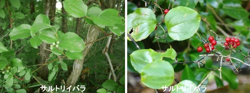 サルトリイバラは、日本全国の日当たりの良い山野に生育するつる性の落葉低木です。国外では、中国、朝鮮半島、台湾から東南アジアにまで分布します。つる性と言っても、茎は硬く、フジなどのように樹木にぐるぐると巻き付くようなことはなく、葉柄部分から出る2本の巻きひげで他の植物にしがみつくようにして成長します。葉は直径3~12cmほどになる円形で、質は厚く、全縁(縁にギザギザがない)、両面無毛です。茎にはまばらに鋭いトゲがあり(トゲの数には個体差があり、ほとんどない個体もある)、葉が着いた部分ごとに折れ曲がってジグザグになっています。花は4~5月頃、葉の付け根の部分から散形花序を出し、淡黄緑色の花を多数咲かせます。果実は液果で、晩秋に鮮やかな赤色に熟します。熟したばかりの時には食べることもできますが(甘くはないが、少し酸っぱい味)、時期が遅くなると、乾燥してしまって中は種子ばかりになります。鳥などに食べられなければ落葉後もつるに残るため、生け花や、クリスマスリースの飾りなどにも使われます。果実の中にはあずき色をした直径1cm弱の種子が5~6個入っています。