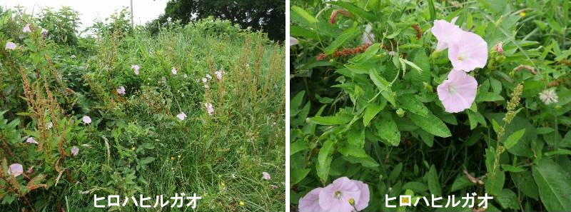 ヒロハヒルガオは北半球のヨーロッパ、アジア、北西アフリカ、北アメリカ、南半球のオーストラリア、南米のアルゼンチンなどに広く分布するツル植物です。検索すると日本では北海道でのヒットが多く、冷温帯の植物なのでしょう。高さ数mになり、葉は長さ5~10cm、幅3~7cmで矢じり形で、花は晩春から夏の終わりまで咲き、直径は3~7cm、花色は白(から青ざめた桃色)です。基本種の他、7亜種が報告されていますが、区別点はかならずしも明瞭ではないらしいです。ヒロハヒルガオは美しい白い花を咲かせるものの、旺盛な成長力で低木に巻きつくなど有害な雑草でもあります。種子は30年以上も発芽能力を維持し、数メートルもの地下茎で繁殖するので、根絶は困難であるとの事でした。ヒロハヒルガオは草地や道端で咲かせる純白の花が特徴のツル植物ですが、周りの植物に巻き付き地下茎を伸ばして繁殖するため、農業においては根絶が難しい雑草とみなされています。