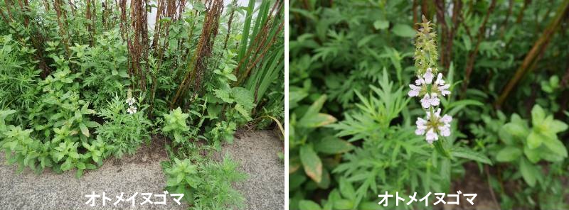 イヌゴマは日本全国の湿地に生育する高さ40~70cmほどになる多年草です。湿地とは言っても、サギソウなどの生えるような貧栄養な湿地よりも、休耕田や畦溝、河川敷などやや栄養分の豊かな場所を好むようです。茎はシソ科の特徴である四角形をしており、稜(角)の上、葉の下面の主脈上には下向きの小さなトゲがあって触るとざらつきます。葉は対生(おなじところに対になって付く)で、長さ4~8cmの細長い三角形、茎の下部の葉にははっきりした柄がありますが、茎の上部の葉柄は短く、茎を抱いているように見えます。地中には長い地下茎が伸び、節から芽が出て広がります。花は7~8月、茎の上部に淡紅色の花が輪生状に多数咲きます。花が終わると5つに裂けた萼(がく)の奥に、黒い種子が3~4個できます。