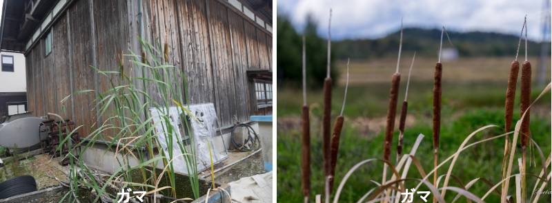 ガマは北海道から九州、および世界の温帯北半球から熱帯、オーストラリアなどに広く分布する多年生の草本です。沼沢地やため池の湖岸、放棄水田などに広く分布しています。大形の抽水(ちゅうすい)植物であり、高さ2m程になりまか。地中に柔らかくて通気組織の発達した太い地下茎を発達させ、群落を形成します。初夏に花茎を形成し、上部に雄花群を、それに接して雌花群を付けます。雄花からは大量の花粉が形成され、飛散する。雌花は成熟するとより太く、褐色になるので、まるで祭りで売っているフランクフルトソーセージのようになります。ガマの生産する花粉の量はすさまじく、これを集めたものを蒲黄(ほおう)と呼び、漢方では利尿剤や止血剤として利用すると言います。葉は柔組織が発達して柔らかくしなやかで、駕籠やむしろなどに細工・加工されます。ガマの加工品はしっとりと柔らかくて手触りがよいです。秋になると穂は綿状になって崩れ、風に乗って飛散します。昔はこの綿毛を集めて布団の綿に使用したり、火をおこす際の火口に利用したこともあるそうです。穂をほぐしてみると劇的に膨らみ、布団の綿として使えそうなホカホカ状態になり、稲葉の白兎で有名な蒲の穂綿です。