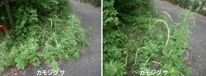 カモジグサは、日本各地、朝鮮・中国にも分布する多年生の草本で、路傍や空き地などに普通に生育しています。秋から生育を始め、初夏に花穂を形成して目立つようになります。花は青紫色を帯びており、黒っぽい頴が伸びているものを採取して束ね、付け髪(かもじ)に例えて遊んだことに由来すると言います。同じ属の植物によく似たアオカモジグサがあり、混生していることもあります。カモジグサの花穂の中軸はアオカモジグサよりも細いのか、より曲がって垂れ下がります。特に種子が稔ってくるとその傾向は顕著になります。カモジグサは平地や草地に普通に見られる多年草です。植物体は大きいもので約1mにもなり、先端の花序の部分が垂れ下がるのが特徴です。この花序は紫色ですが,青っぽいものは「アオカモジグサ」とよばれて区別されています。しかし色は中間的な形質を持つものが多産するのでまぎらわしいです。この場合,小穂がまばらについているのがカモジグサです。