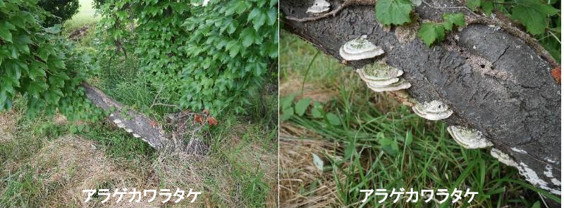 荒げ川原岳は、以前はサルノコシカケ化とされていましたが、他行金貨又は玉猪苓岳かともいわれています。倒木に繁殖し、カイガラタケ同様、漢方では癌に効くと言われるキノコ類の一つです。薬用になるので毒ではありませんが、苦く硬いので食用にはなりません。カワラタケは、一般的に食用には適さないとされています。非常に硬い肉質で、食べても美味しくないため、食用不適とされています。また、一部では免疫力を高める物質を含むとして薬用キノコとして扱われることもありますが、毒性成分も含まれている可能性があるため注意が必要です。カワラタケの培養菌糸体は抗がん剤として使用されているクレスチンの原料 で、これは医薬品としての実績があります。 カワラタケの子実体は高血圧予防や強壮、健 胃、美肌などに関心がある方向けの健康食品として、その機能性が注目されています。アラゲカワラタケは、生育する環境によって色の違いを観察することができます。傘の表面は短い毛で覆われていて、乾燥しているときは光が反射して光沢があるように見えます。 裏側は管孔になっていて、未熟なものでは白色をしていますが成長すると次第にクリーム色、褐色へと変化していきます。