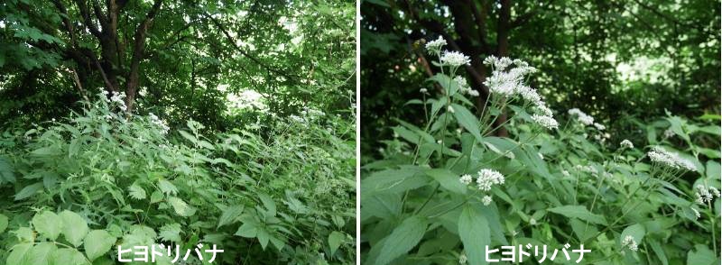 ヒヨドリバナは、北海道から九州の各地に分布するキク科ヒヨドリバナ属の多年草です。日本の在来種であり、山野の草地や林縁に自生し、夏から秋にかけてフジバカマに似た花を多数咲かせます。日本以外では中国や朝鮮半島、フィリピンなどに分布しています。ヒヨドリバナという名前は、ヒヨドリが鳴く頃に咲くこと、あるいは花殻に生じる綿毛(冠毛)がヒヨドリの冠毛に似ることによります。花は頭状花と呼ばれるタイプの小さなもので、枝分かれの多い花茎の先に散在します。筒状の小花が五つ集まって一まとまりになり、花色は普通、白色ですが、土壌によっては淡い紫を帯びます。花から飛び出すのは雌しべで、先端が二つに裂けています。ヒヨドリバナの葉は長さ6~18センチほどで、先端が尾状に少し尖った長楕円形で、茎から対になって生じます。両面に縮れた毛があり、葉の裏には腺点と呼ばれるものがたくさんあります。
