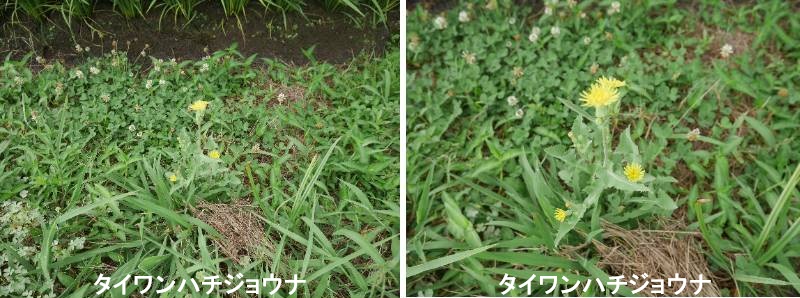 タイワンハチジョウナは、キク科ノゲシ属の一種です。ヨーロッパ原産で、外来種として世界的に分布しています。道端や荒地で見られれ、背丈は高く、80~150cmほどにもなります。ノゲシ同様に茎は直立し、頭頂部で分枝し数個の頭花をつけます。葉は比較的下部につき、茎を抱きます。日本ではタイワンハチジョウナが古くから沖縄に帰化していることが知られており、最近は各地で見られるようになったといわれています。開花は5月から開始した。6月中旬~7月上旬に花が一度終わり、新しい花茎が出て再び開花し、秋まで花が続きます。茎は無毛、葉は下部に集まってつき、長さ9~31㎝、幅1.5~10㎝、羽状に分裂し、葉の縁には刺状の鋸歯があり、葉の基部は茎を抱く。葉裏は粉白色です。茎の上部には苞のような小さな葉があり、春の羽状に分裂する葉は春の花が終わる頃には枯れ、夏の葉は分裂が少なく、ほぼ全縁です。