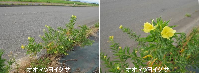 オオマツヨイグサはアカバナ科マツヨイグサ属の二年草です。北米大陸の原種をもとに、ヨーロッパで作り出された園芸種とも云われています。日本では帰化植物の一つとされ、誤ってツキミソウとも呼ばれてます。和名はマツヨイグサよりも大形の意味です。二年草または短命な多年草で、直立して高さは50~150cmになります。茎は全体に硬い毛が生え、毛の基部が膨れて暗赤色の凸点になります。根性葉は地面に張り付いてロゼットをつくり、柄がついて葉先が円くなりますが、茎上の葉は無柄で葉先が尖っています。茎の葉は狭楕円形から披針形で、長さ5~15 cm、幅2.5~4 cm位です。ともに縁にはまばらに鋸歯があり、葉面は凹凸があって中央脈は白色を帯びています。花期は夏(7~10月)で、花は径8cm内外、無柄で子房下位、自家和合性があり、夕方に咲いて翌朝にしぼみます。黄色い花弁は4枚で、広倒卵形で長さよりも幅のほうが大きいです。花がしぼむと黄色から赤橙色に変わります。