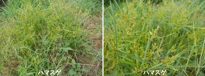 ハマスゲは、世界の強害雑草のトップにあげられている雑草で、熱帯や亜熱帯地方の畑地に広く分布しています。わが国では東北以南の海岸の砂地、河原、樹園地、芝地、農道などに分布していますが、暖地や沖縄では畑地にも発生します。刈り取りに耐性を示すので、ゴルフ場などの芝地で問題となっています。春に気温が10~15℃になると塊茎から萌芽してきますが、萌芽の適温は30~35℃であり、生育には高温と光の強い条件を好む植物です。塊茎は土中0~6cm層に多く形成されますが、地下30cmからも萌芽できます。地上部の茎葉は刈り取りに対して強い耐性を示します。自然光下で生育した場合、毎週続けて9回地上部を切除しても、なお容易に茎葉が再生するばかりか、植付け21日後の4回目の切除時には新塊茎の形成が認められています。しかし、55%程度の遮光条件下では、毎週7回の切除で茎葉の再生は停止し、萌芽力を失ったとされます。