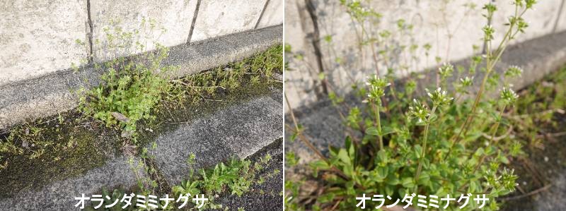 オランダミミナグサ(和蘭耳菜草)は、ヨーロッパ原産のナデシコ科の帰化植物(越年草)で、春(4〜5月)に白い小さな5弁花を密集して咲かせる雑草です。全体に白い毛が密生しており、ネズミの耳に似た葉を持つのが特徴。道端や畑に普通に見られ、繁殖力が旺盛です。全体に腺毛(粘り気のある毛)が多く、黄緑色〜淡緑色をしています。茎の先に、先端が2裂した小さな白色の花を多数つけます。日当たりの良い乾燥した場所を好み、秋に芽生えて春に開花します。名前の由来は、ヨーロッパ(オランダ)から来た、ネズミの耳(ミミナ)のような葉を持つ野草(菜)からです。繁殖力が非常に強く、園芸では雑草として扱われ、庭や畑では抜き取りや駆除が必要になることがあります。在来種のミミナグサは花柄が長く花が垂れ下がるが、オランダミミナグサは花柄が短く、花が固まって咲くことで区別できます。