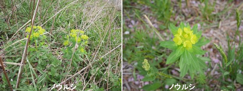 ノウルシは、川原の湿った草原などに生えるトウダイグサ科の多年草です。茎を切ると漆に似た白い乳液が出て皮膚につくとかぶれることがあるので「ノウルシ」といわれます。花は3月から5月にかけて咲きます。春にいっせいに花を咲かせたあと、夏までに地上部が枯れてしまい、種で繁殖するか根から新しい芽が出るクローンで増えますが、近年は湿地