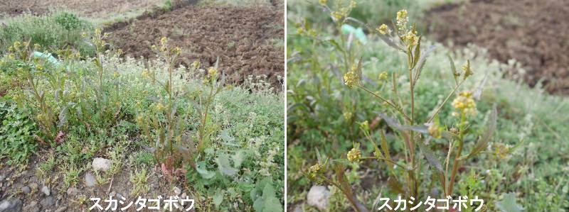 スカシタゴボウ(透かし田牛蒡)は、日本全国の田んぼの畔や湿った道端に生える、アブラナ科イヌガラシ属の越年草(または一年草)です。春から夏にかけて黄色い小さな花を咲かせ、実がふっくらした円柱形になるのが特徴。葉の切れ込みが深く、透けて見えるように見えることが名の由来と言われています。高さ30~80cmになり、茎の先端に黄色い花を密に咲かせます。イヌガラシが細長い実をつけるのに対し、スカシタゴボウはふっくらとした短い円柱形の実(長角果)をつけます。根元の葉は深く裂けていますが、切れ込みの程度には大きな個体差があります。種子で繁殖し、農家にとっては春先の「強害雑草」として知られることがあります。名前の由来は、下部の葉の切れ込みが大きく「透かし」彫りのように見えること、水田(田)に生え、根がゴボウのように見える(実際はそれほど似ていません)ことからきていると言われています。