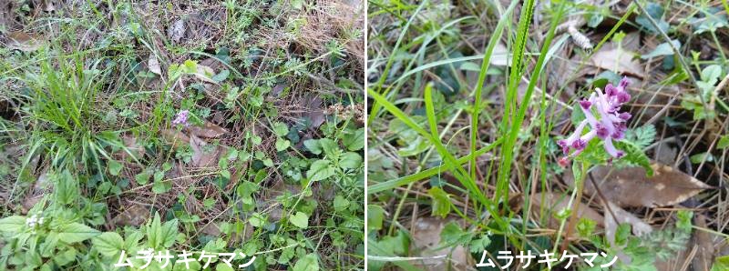 ムラサキケマン(紫華鬘)は、春に薄紫色の花を咲かせるケシ科キケマン属の越年草です。山野の湿った場所や道端によく見られ、花の形が仏殿の装飾具「華鬘(けまん)」に似ることが名の由来です。全草に有毒成分(プロトピンなど)を含むため、絶対に食べないでください。4月~6月。春先、20〜50cmほどの細い茎の先に、紅紫色の花を総状にたくさん咲かせます。葉は柔らかく、細かく裂けています(2回3出複葉)。花は左右対称で、後ろ側が袋状(距)に突き出しています。果実は細長いサヤ状で、熟すと触れただけで弾けて種を遠くに飛ばします。アルカロイド系の毒性があり、嘔吐や呼吸麻痺、心臓麻痺を引き起こす可能性があるため注意が必要です。白い花を咲かせる変種は「シロヤブケマン(白藪華鬘)」と呼ばれています。