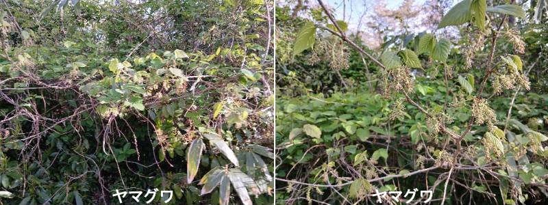 ヤマグワは、北海道から九州まで日本全国の丘陵や山地に広く自生するクワ科の落葉樹で、かつては中国産のマグワと共に養蚕のための重要な飼料として栽培され、「蚕が食う葉」から「クワ」と呼ばれています。最も普通に見られるクワの一種で、単にクワという場合は本種を示すことが多く、日本以外でも中国や朝鮮半島に分布しています。ヤマグワの葉は長さ7~20センチ、幅5~12センチほどで、枝から互い違いに生じ、いづれも付け根付近から3本に分かれる葉脈が目立ちます。ヤマグワの開花は4~5月頃で、その年に伸びた枝葉の脇に花が咲きます。花弁はなく、雄花には4本の雄しべ、雌花には長さ2~3センチの雌しべが1本あり、その先端(柱頭)は二つに裂けています。クワの葉には特殊なアルカロイドが含まれており、蚕の仲間以外はこれを食べません。蚕はクワ以外にもコウゾ、タンポポ、チシャ、アキノノゲシなども食べますが、クワの葉を最も好みます。