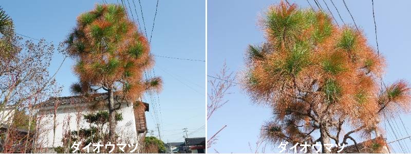 ダイオウマツ(大王松)は、北アメリカ東南部原産の常緑針葉樹(マツ科)で、世界最長クラスの長さ20〜50cmにもなる針葉が特徴です。別名「ダイオウショウ」「ロングリーフパイン」とも呼ばれ、公園樹や洋風のシンボルツリーとして植栽されるほか、巨大な松ぼっくりはフラワーアレンジメントや工作の材料として人気があります。マツ属の中で最も長い葉を三本一組(三葉松)でつけます。葉は柔らかく、枝の先端に密生し、樹高は40mを超えることもある巨大な松で、若木は特に葉が長く垂れ下がります。長さ15〜25cmの巨大な円柱形の球果をつけ、10月頃に熟します。庭園樹のほか、その巨大な松ぼっくりがクリスマスリースや正月飾り、生け花、工作用として非常に人気があります。大王松は、その雄大な姿から「マツの王様」とも言われ、街中や公園で大きな松ぼっくりを探す楽しみがある庭木です。