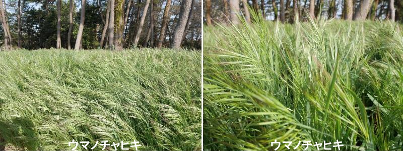 ウマノチャヒキ(馬の茶挽)は、ヨーロッパからの帰化植物で、イネ科スズメノチャヒキ属の一・二年草です。日本全国に逸散し、人の手が入らない空き地や荒地で繁殖しています。全草に軟毛があり、茎は中空で細く直立しますが、穂が重く垂れ下がります。初夏〜夏に、緑色の小花を咲かせますが、葉や茎色と同色で、しかも小さいため目立ちません。全体的に咲きはじめは緑色をしていますが、終わりに近づくと茶色っぽくなります。5〜7月頃、小穂が重くなり、先端が下垂する頃緑色から徐々に茶色へと変色します。成長が早く、1株で多数の種子(300以上)を生産し、風や動物に運ばれます。明治末期〜大正初期に帰化しました。ウマノチャヒキは、乾燥した土地でもよく育つため、市街地の環境にも適応している帰化植物です。