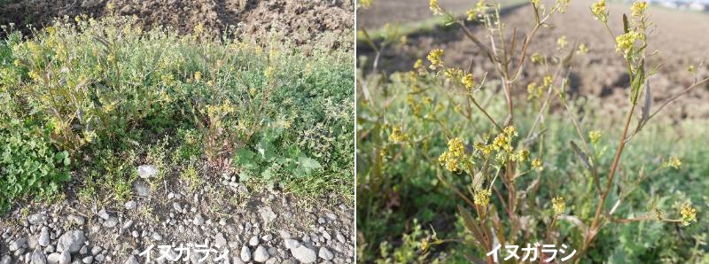 イヌガラシ(犬芥子)は、アブラナ科イヌガラシ属の多年草で、日本全国の田の畔や河川敷、道端の湿った場所に生える代表的な雑草です。春から秋にかけ、黄色い4弁の小花と、細長く湾曲する実(長角果)を多数つけます。カラシナに似るが食べられない(または美味しくない)という意味で「犬」の名がつきましたが、実は食用や薬用(利尿など)にも利用可能です。道ばたや野原、畑地、あぜなど、いたるところにごく普通に生えています。花は春から秋にかけて、長い間咲き続けます。日当たりの良い暖かい場所では、真冬でも花をつけていることがあります。冬は寒風や霜で地上部が枯れたようになりますが、多年草ですので、根で越冬し、春になると再び芽を出します。イヌガラシのイヌは否(イナ)が訛ったもので、「カラシナに似て非なるもの」という意味です。カラシナとは別種ですが、同じアブラナ科の植物で、食用になります。