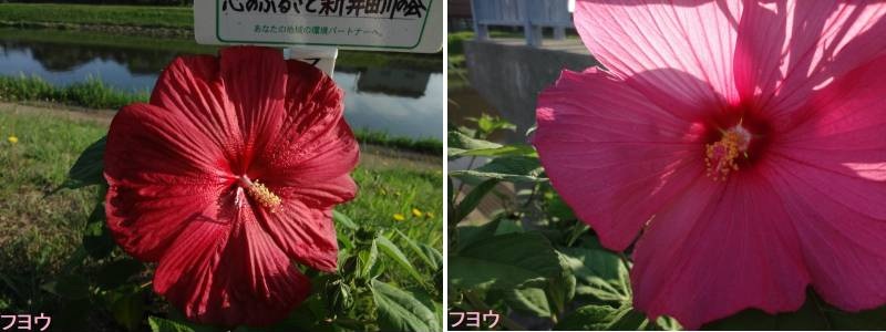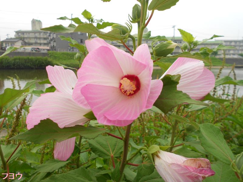 syriacus)がありますが、一般的には雌しべの先が上向きに曲がっているのがフヨウ、まっすぐなものがムクゲと区別できます。フヨウの園芸品種は多くありませんが、ピンク以外にも、白花や八重咲きが販売され、草本のアメリカフヨウとの交配種もあります。フヨウ属にはハイビスカス(H.