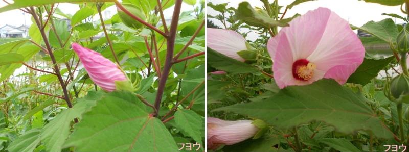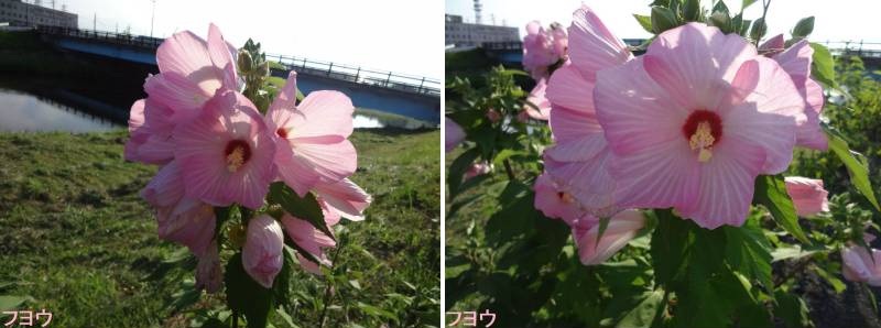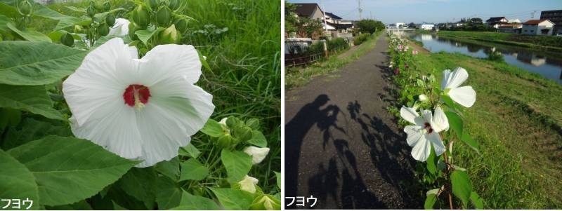 咲き始めは白色で時間が経過するにつれてピンクがかってきて夕方しぼむ頃には濃いピンク色になる八重咲きのスイフヨウ(酔芙蓉)などの変種が知られています。これは徐々に赤みがかってくる花色の変化を酔っぱらっていくのに例えて付けられた名前です。古くには芙蓉の樹皮は下駄の鼻緒や和紙の補強剤、縄などに加工されて身近な生活用品として使われていました。また、アオイ科フヨウ属には本種以外にもムクゲ、ハイビスカス、アメリカフヨウ(クサフヨウ)などの仲間がよく知られています。種小名のムタビリスは「変わりやすい」という意味で、時間の経過とともに花色の変化する種があるところから来ています。