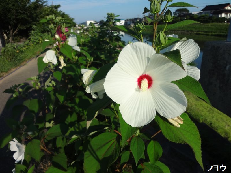 フヨウ(芙蓉)とムクゲ(木槿)は同じはアオイ科フヨウ属の樹木で、花の咲く時期や姿形も何となく似通っているので間違うことがよくあります。フヨウはよく枝分かれして上だけでなく横にも枝がよくはりこんもりと茂るのに対してムクゲはすらっと直立した樹形になります。また葉や花もフヨウの方がムクゲよりも明らかに大きいので、案外ちゃんと見れば見分けが付きます。フヨウ(芙蓉)は、暑い夏の盛りにピンクや白の大輪の花を咲かせるアオイ科の落葉低木です。10~15cm程度の大輪の花が8月~10月に開花します。桜のように開花期間が1週間程度の花木も多い中で、フヨウ(芙蓉)は夏の間、長くたくさんの花が開花します。ひとつひとつの花は一日花で、朝に開花し夕方にはしぼみます。