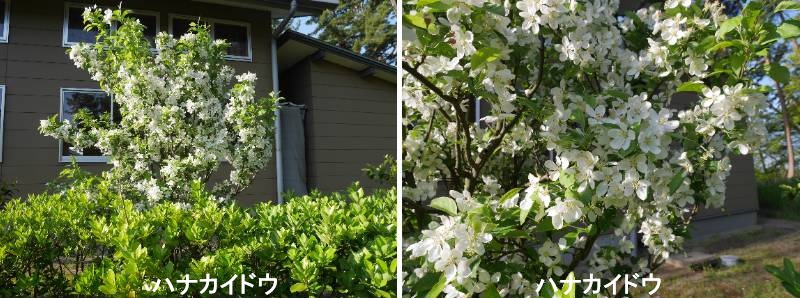 ハナカイドウは一般に「カイドウ」とも呼ばれて、日本では広く北海道南部から九州まで栽培されています。リンゴと同属の落葉果樹で、原産地の中国でも古くから栽培され、その花の美しさは、中国の唐の玄宗皇帝が酔って眠る楊貴妃をハナカイドウにたとえたように、昔から美人の代名詞として使われるほどです。4月から5月の庭に新緑が目立ち始めるころに枝を埋めるようにして咲くピンク(淡紅色)の花が目に鮮やかです。ハナカイドウの花は、下向きに咲くのが特徴です。