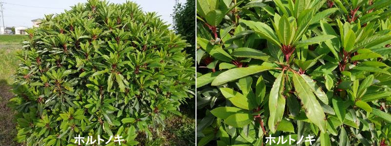 ホルトノキは、本州南部以西から沖縄に分布する常緑高木で、ヤマモモに似た葉を持ち、古い葉が赤く紅葉して年中緑と赤の葉が混ざって見えるのが特徴です。夏に白い小さな花を咲かせ、冬に黒紫色の実が熟します。公園樹や街路樹として利用され、潮風に強く、大気汚染にも強い性質から都市部での植栽も増えています。常緑広葉樹の高木で、 葉は互生し、枝先に束のように生えます。葉身は長さ5~12センチメートル の倒披針形または長楕円形で、やや鋸歯があり、ヤマモモに似ていますが厚みがあります。葉は古くなると紅葉して落ちます。 本州南西部・四国・九州などにみられ、かなりの大木になりますが、この木のように幹の径が1mを超える木はあまり多くありません。 この木は目通りの径が約1.2m、高さも15m以上もあり、枝を横にはり出してこの木一本でひとつの森を作り出しています。