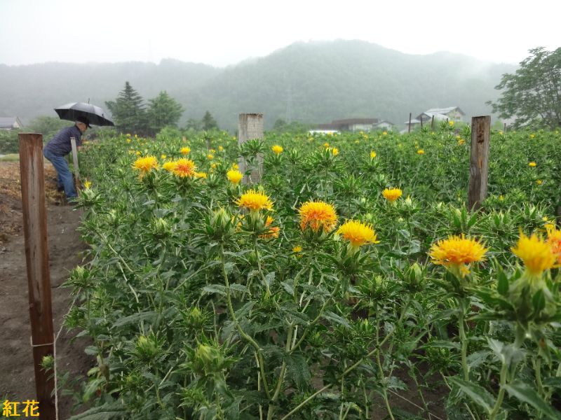 紅花は黄色から赤になる花を咲かせるキク科の1年草です。花弁から染料や口紅の元になる色素がとれることから,古くから南西アジア・北アフリカを中心に広く栽培されてきました。山形では江戸時代に最上紅花の栽培が盛んでした。このため,紅花は山形県の県花に指定されています。キク科ベニバナ属ベニバナで、耐寒性の一年草です。秋に種をまき,夏に花を咲かせ,翌冬に枯れます(山形では早春に種をまきます)。成長すると草丈は0.5~1m,葉は5~10cmほどになり,初夏に半径2.5~4cmのアザミに似た花を咲かせます。咲き始めは鮮やかな黄色の花ですが,やがて色づき,赤くなります。種子は花1つにつき10~100個ほど,ヒマワリの種を小さくしたような種子がつきます。葉のふちに鋭いトゲがあり,このため花摘みはトゲが朝露で柔らかくなっている朝方に行われました。