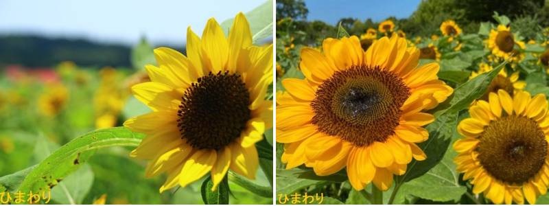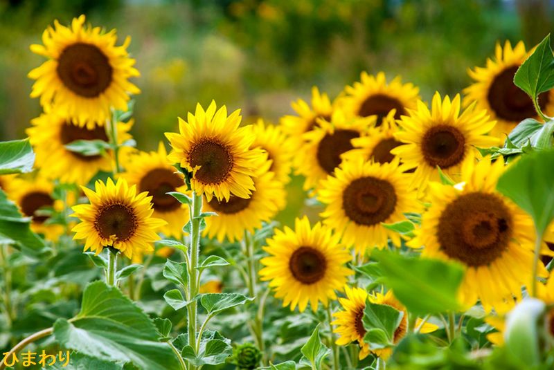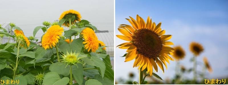 蕾が大きくなると成長が止まり、茎は東側を向いたまま動かなくなります。さらに、茎の中に含まれる成長ホルモンは、日陰になっている茎の方が日向に生える茎よりも多く分泌されるため、日陰側の茎は日向の茎より早く背が高くなり、その上に被さりながら蕾をつけます。このため、ひまわり畑ではすべての花が太陽の方を向いているように見えるのです。ひまわりは、日本語で漢字にすると「向日葵」のほかに「日廻り」や「日回り」と表記されることもありますが、これは、こんなふうに太陽に向かって成長するひまわりの「向日性」を表した名前だったのです。ひまわりの種類は非常に多く、野生種だけで60種類も存在すると言われています。ひまわりと言えば人の背丈よりも高い花というイメージがありますが、近年では品種改良が進み、プランター栽培や切り花のアレンジメントに適した小ぶりのものが生まれて、より多くの形で楽しめるようになりました。