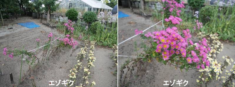 エゾギク(蝦夷菊)は、キク科の園芸植物で、かつてはシオン属に分類されていたため、一般にアスターと呼ばれていますが、現在では1種だけでエゾギク属 に分類されています。中国東北部からシベリア原産の半耐寒性一年草で、草丈は30~100cmに達します。茎は直立し、葉は柄があり、長楕円形で互生、茎・葉共に白い毛が生えています。野生、栽培問わずに自由に交雑します。18世紀に原産地の中国からフランスに持ち込まれ、その後、アメリカを経由して、日本にも伝わりました。ヨーロッパではミカエル祭の頃に開花することから、「ミカエル祭の夜」という別名を持っています。花は花径3cmくらいの小輪から10cmを超える大輪まであり、頭花は白・ピンク・赤・藍色などがあり、中心の黄色と美しいコントラストをなす物も多いです。花の形には、一重咲きと八重咲き、重ねの厚いぽんぽん咲きがあり、管弁のものもあります。
